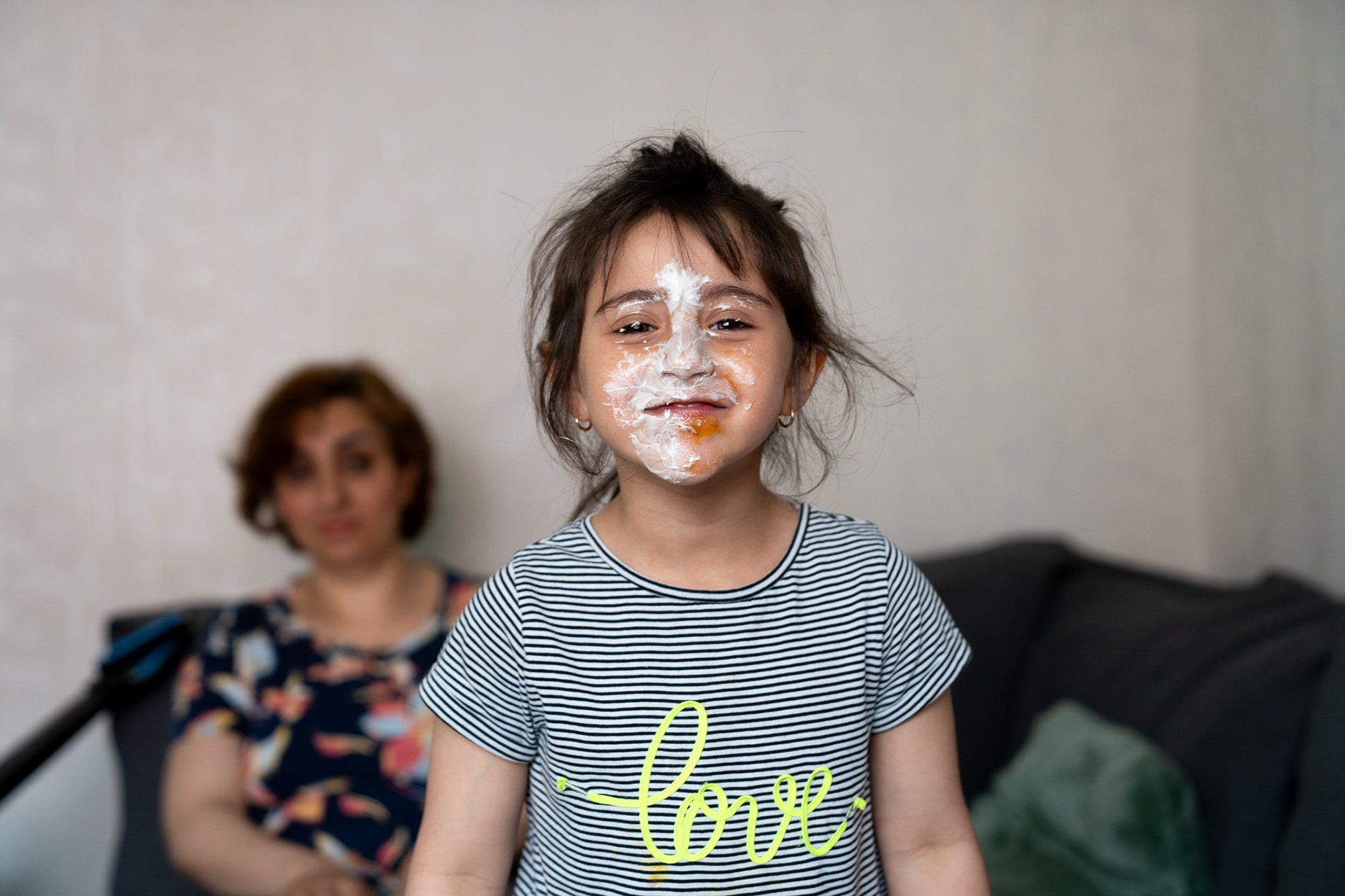 Oikeanpuoleisessa kuvassa kokkolalainen Arisa Babam sotkee naamansa kermavaahdolla ja saa äitinsä Arezou Babamin hetkeksi nauramaan, vaikka kotimaa Iranin tilanne saa arjen tuntumaan ylivoimaiselta.