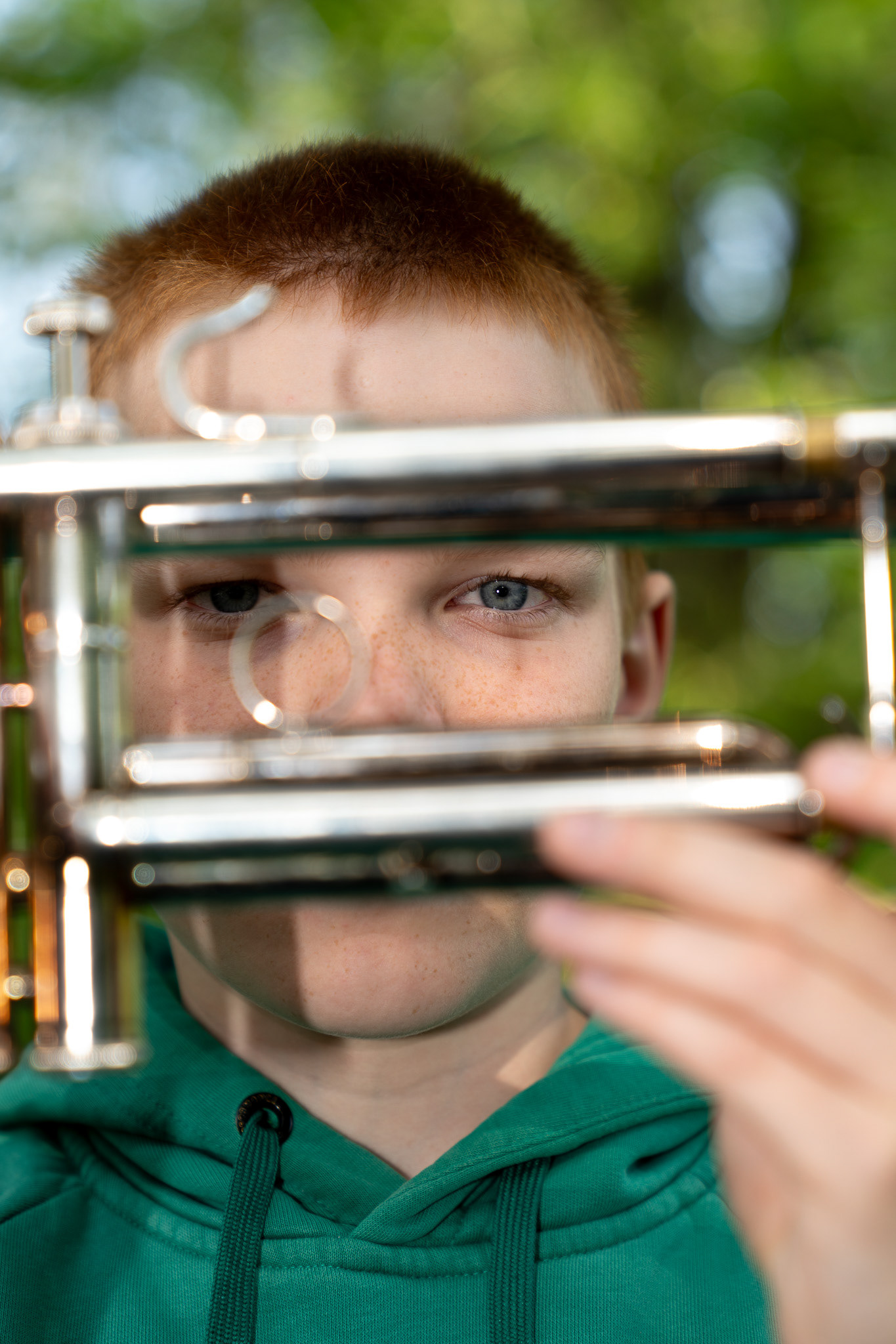 Vasemmanpuoleisessa kuvassa kokkolalainen Martti Peltoniemi esittelee trumpettiaan, jota soittaa Kälviän musiikkileirillä.