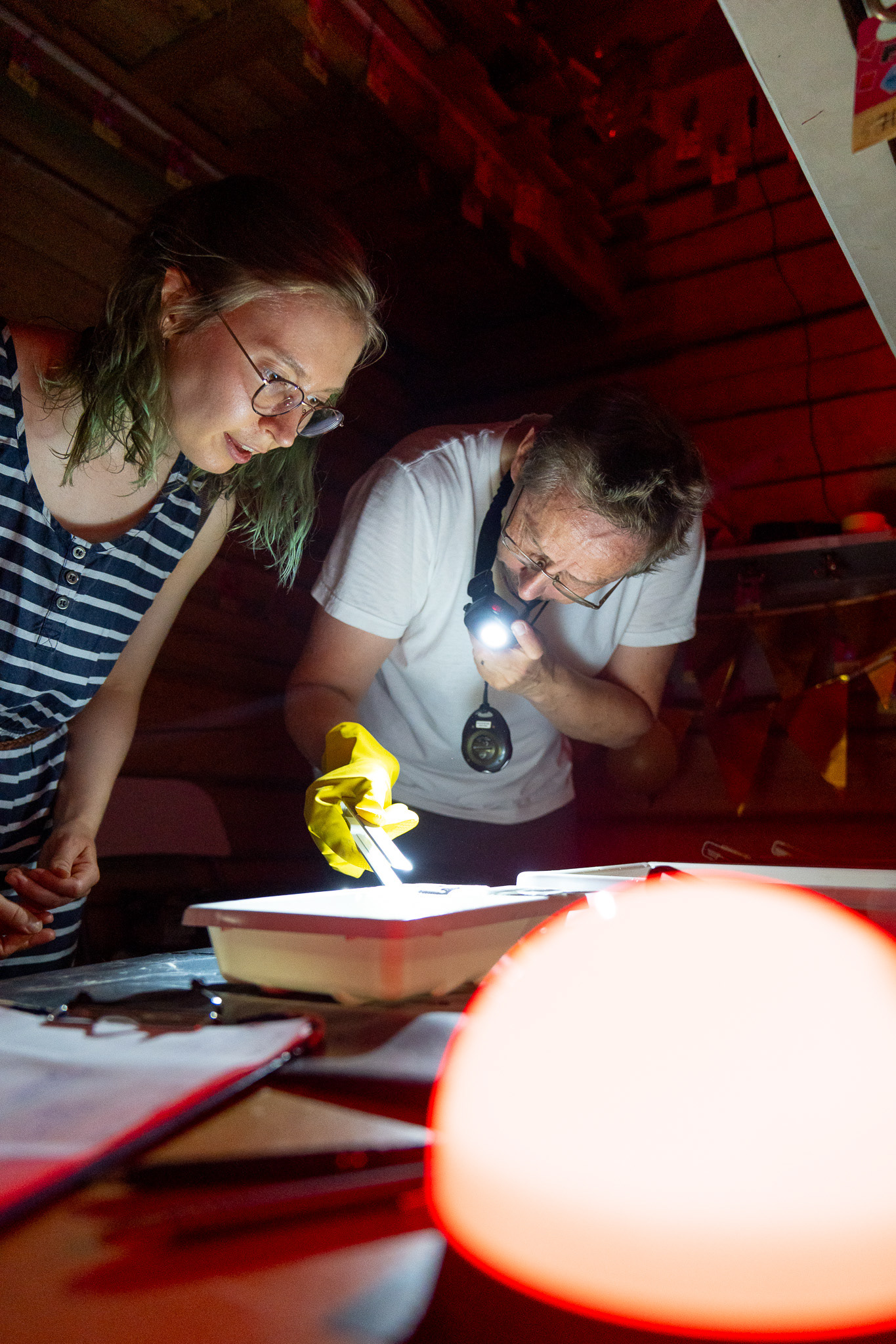 Vasemmanpuoleisessa kuvassa Häsbacka kehittää järjestämässään työpajassa kahvipaketista rakennetulla kameralla otettua kuvaa.